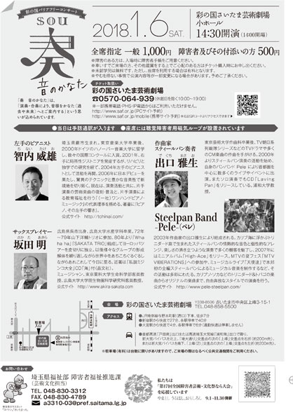 昨年に引き続き、今年も、埼玉県障害者アートフェスティバル実行委員会主催の、彩の国バリアフリーコンサートに出演しました。「奏(sou) 音のかなた」と題して開催されたコンサートでは、蕨市出身の左手のピアニスト、智内威雄氏、サックスプレイヤーとして著名な坂田明氏とPeleが出演しました。Peleの演奏中には、今年も、このコンサートに向けて練習を重ねた障害のある方たちと共演しました。